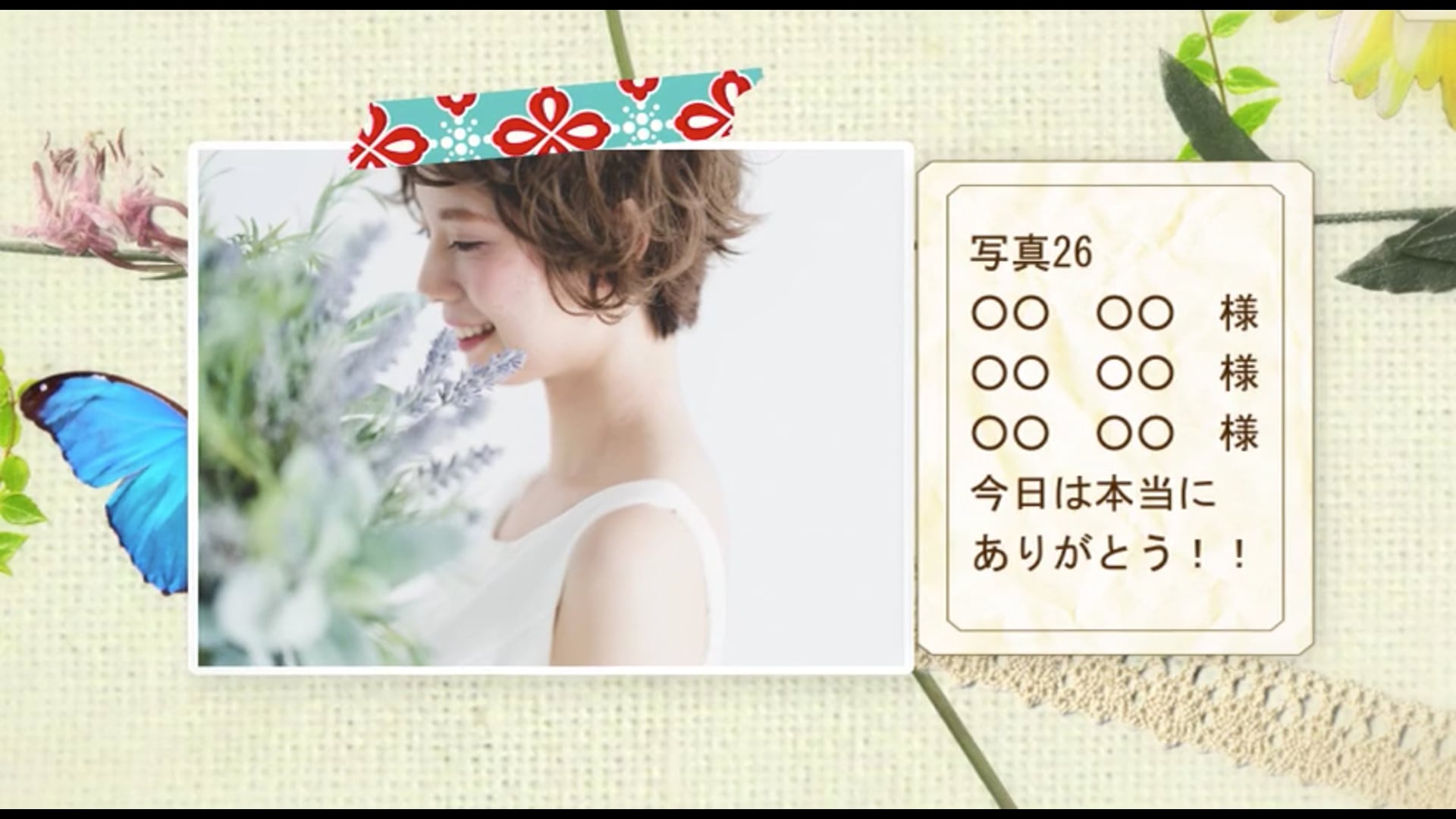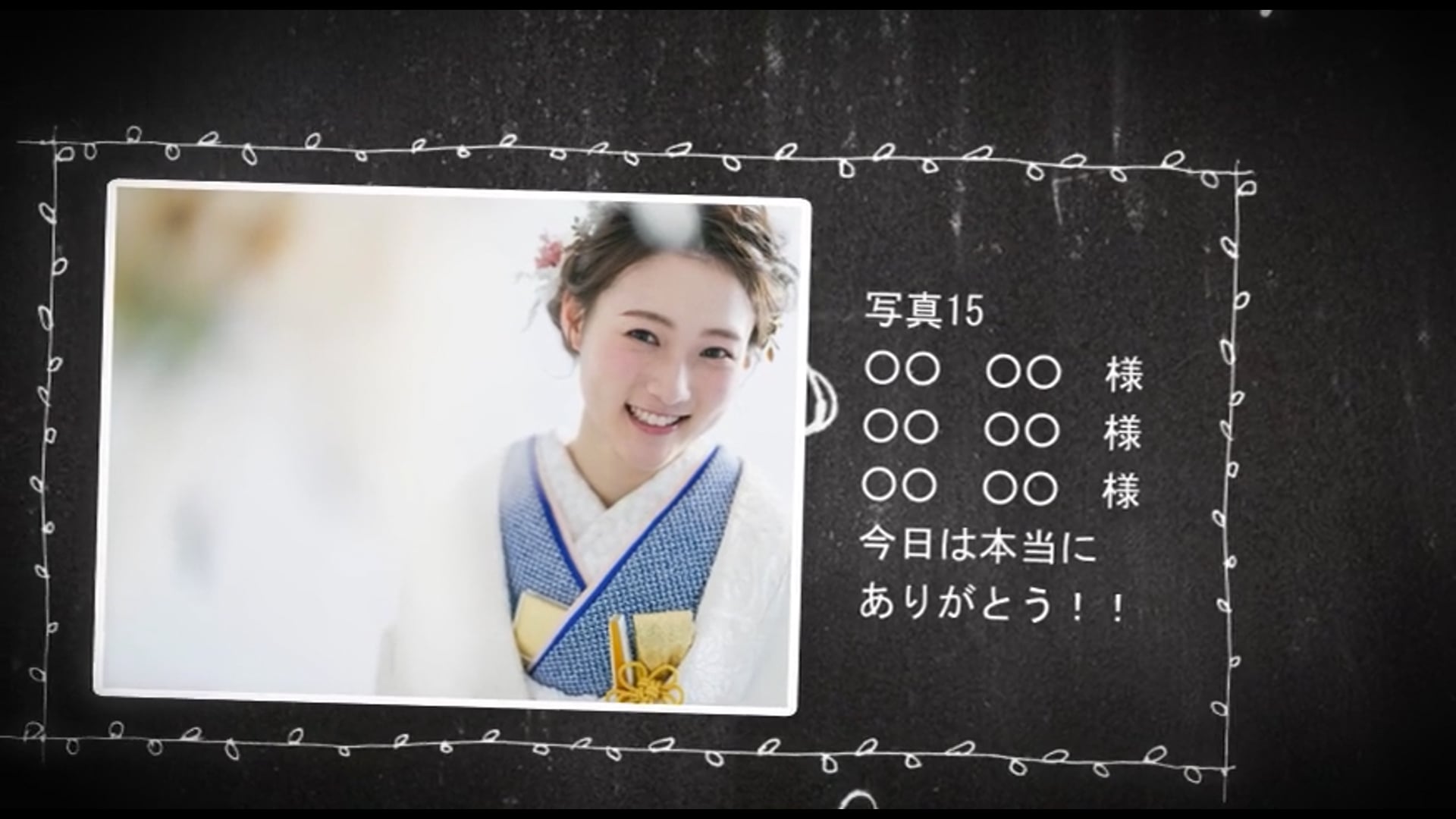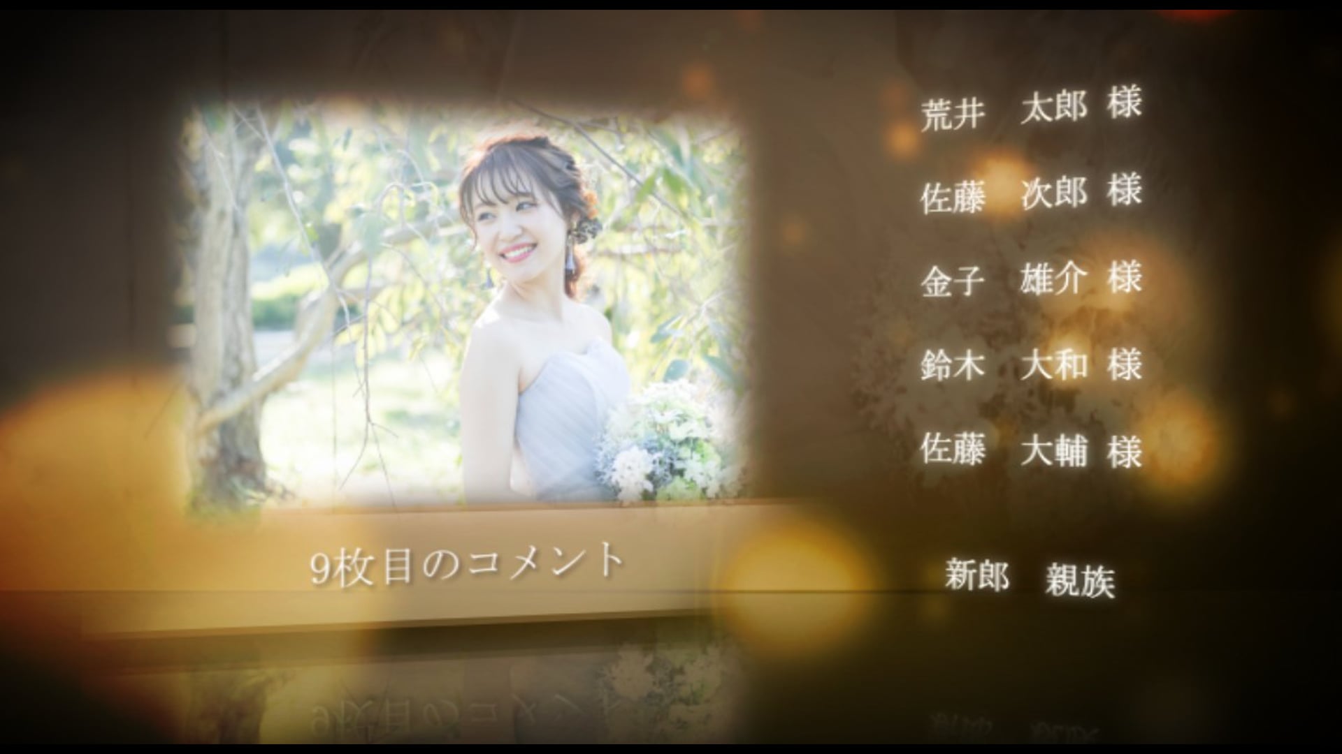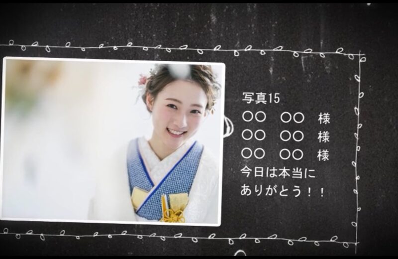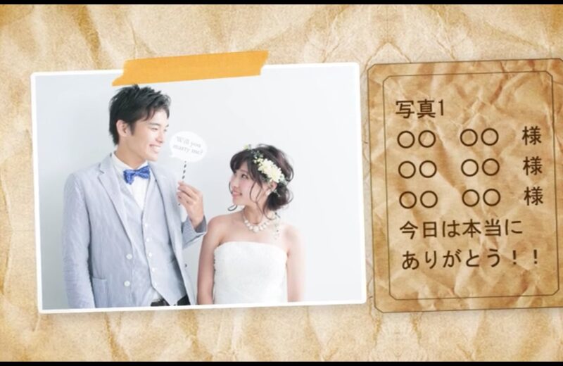 このムービーテンプレートの最大の魅力は、写真やメッセージを自在に差し替えられる点です。お二人の思い出やエピソードを盛り込みながら、個性的な作品に仕上げることが可能です。