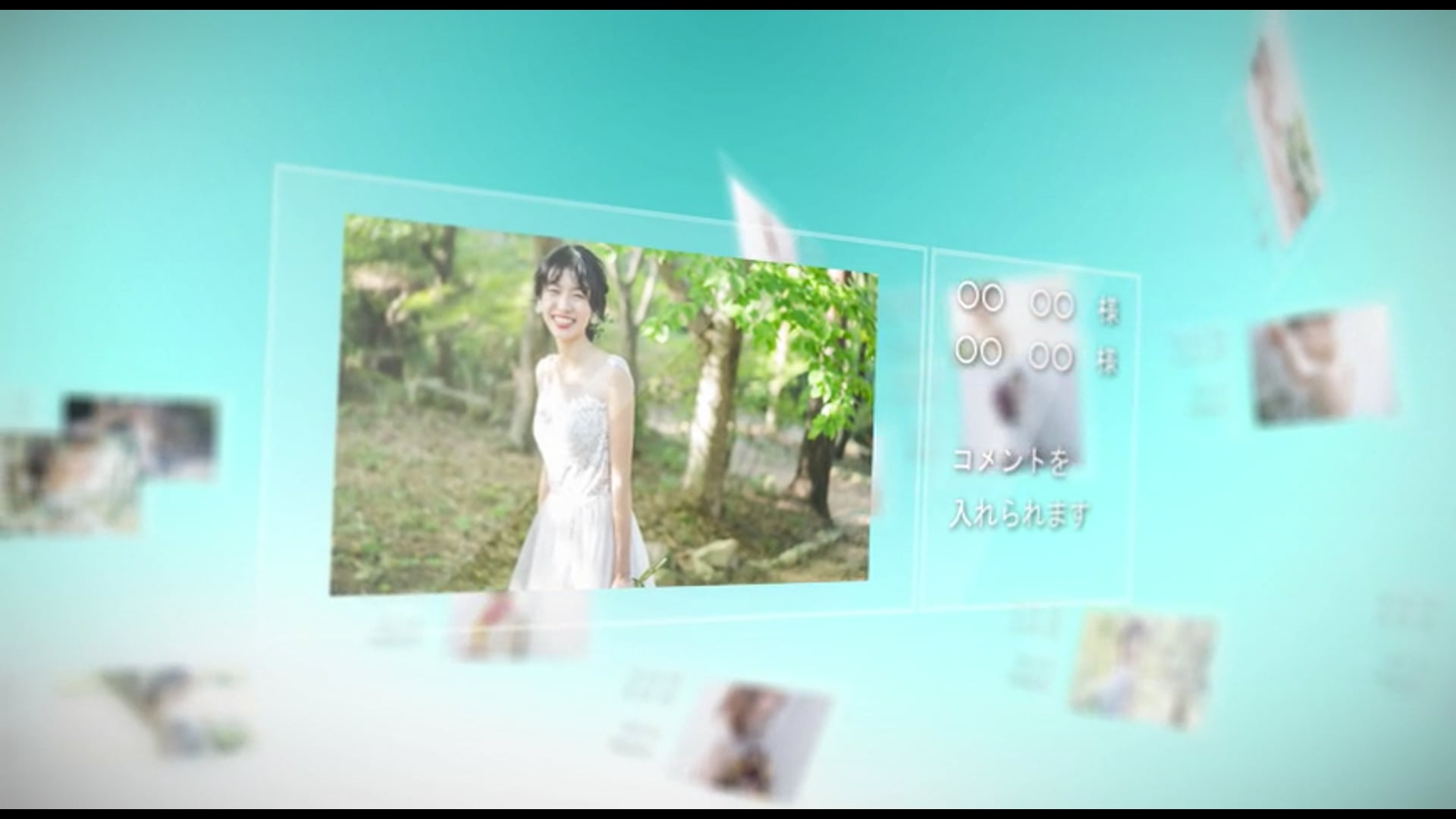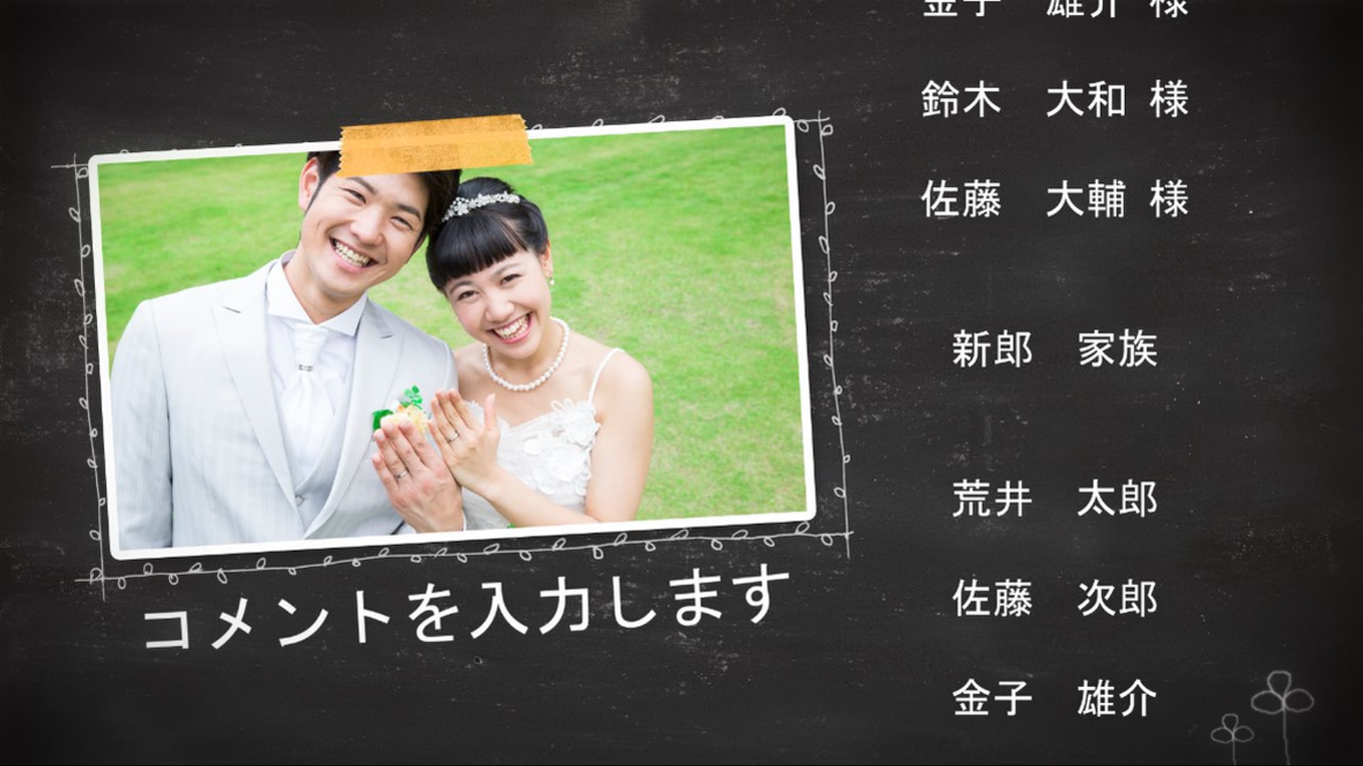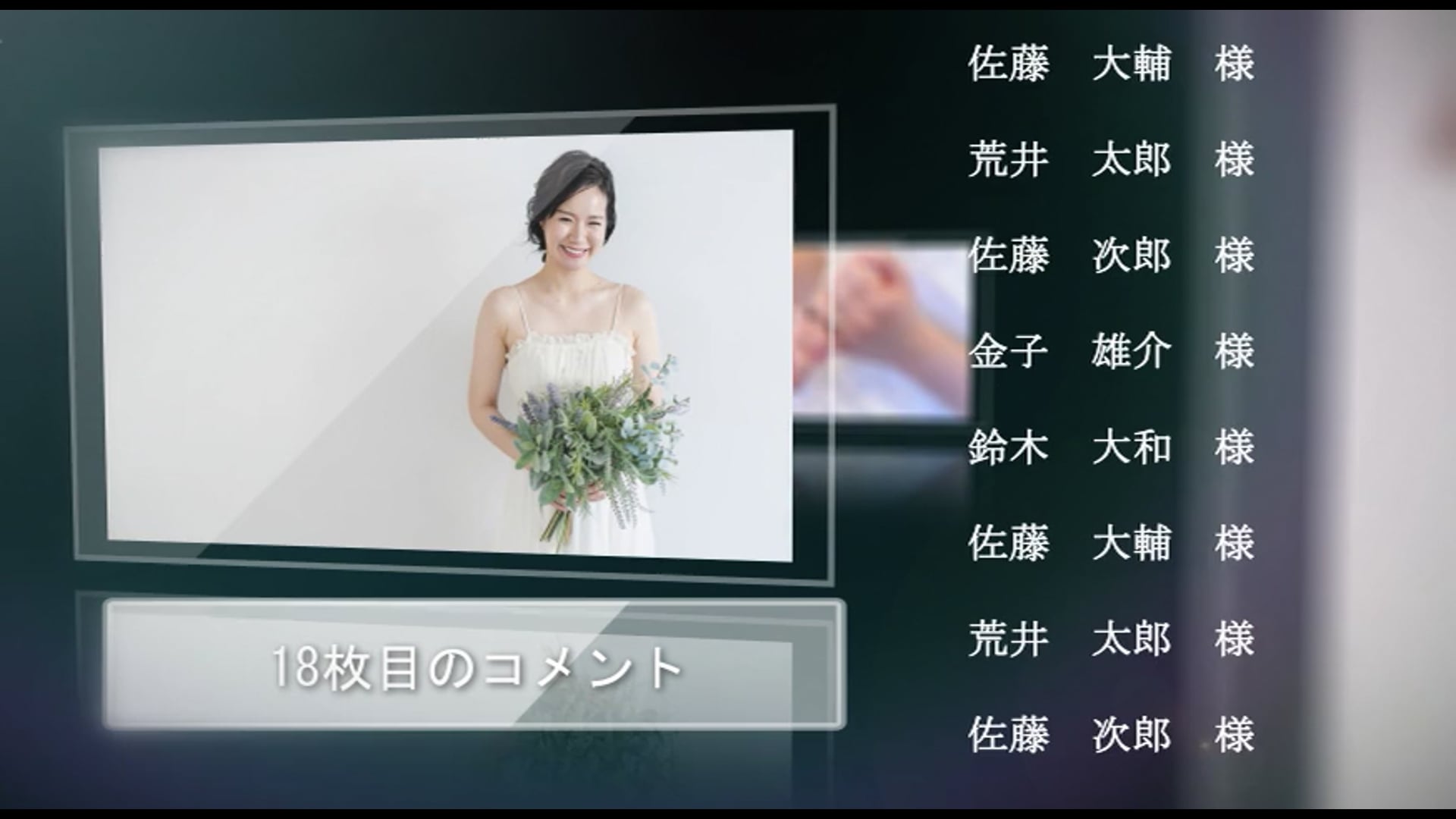このムービーテンプレートの最大の魅力は、写真やメッセージを自在に差し替えられる点です。お二人の思い出やエピソードを盛り込みながら、個性的な作品に仕上げることが可能です。