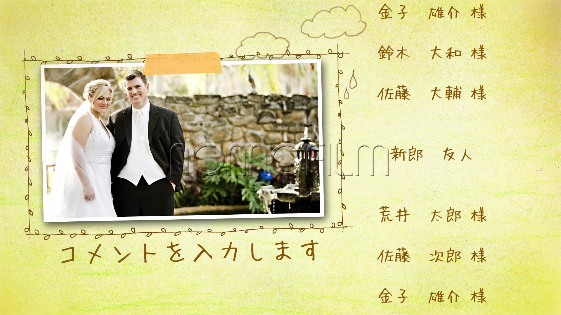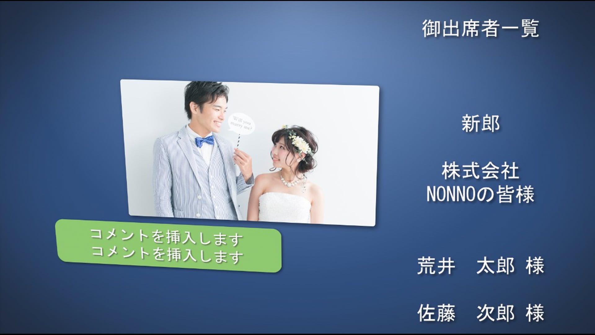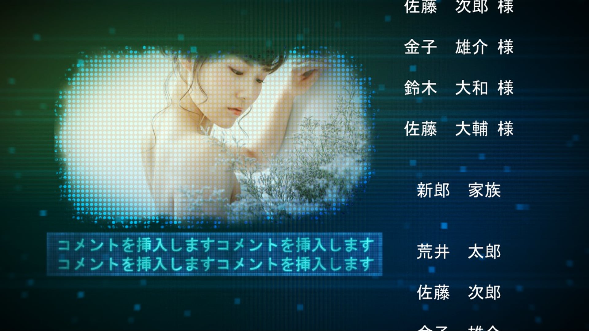 • サンプルに利用されているBGM、写真、フォントは含まれていません。お好きなBGMと写真、コメントを自由に挿入してください。
